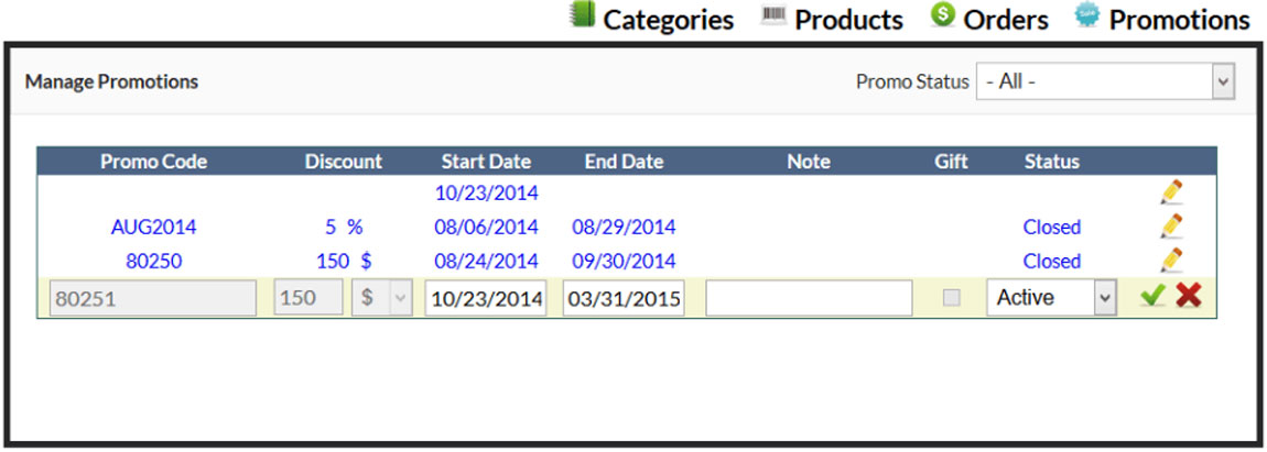 Enter in discounts, start and end dates, and special promo codes.